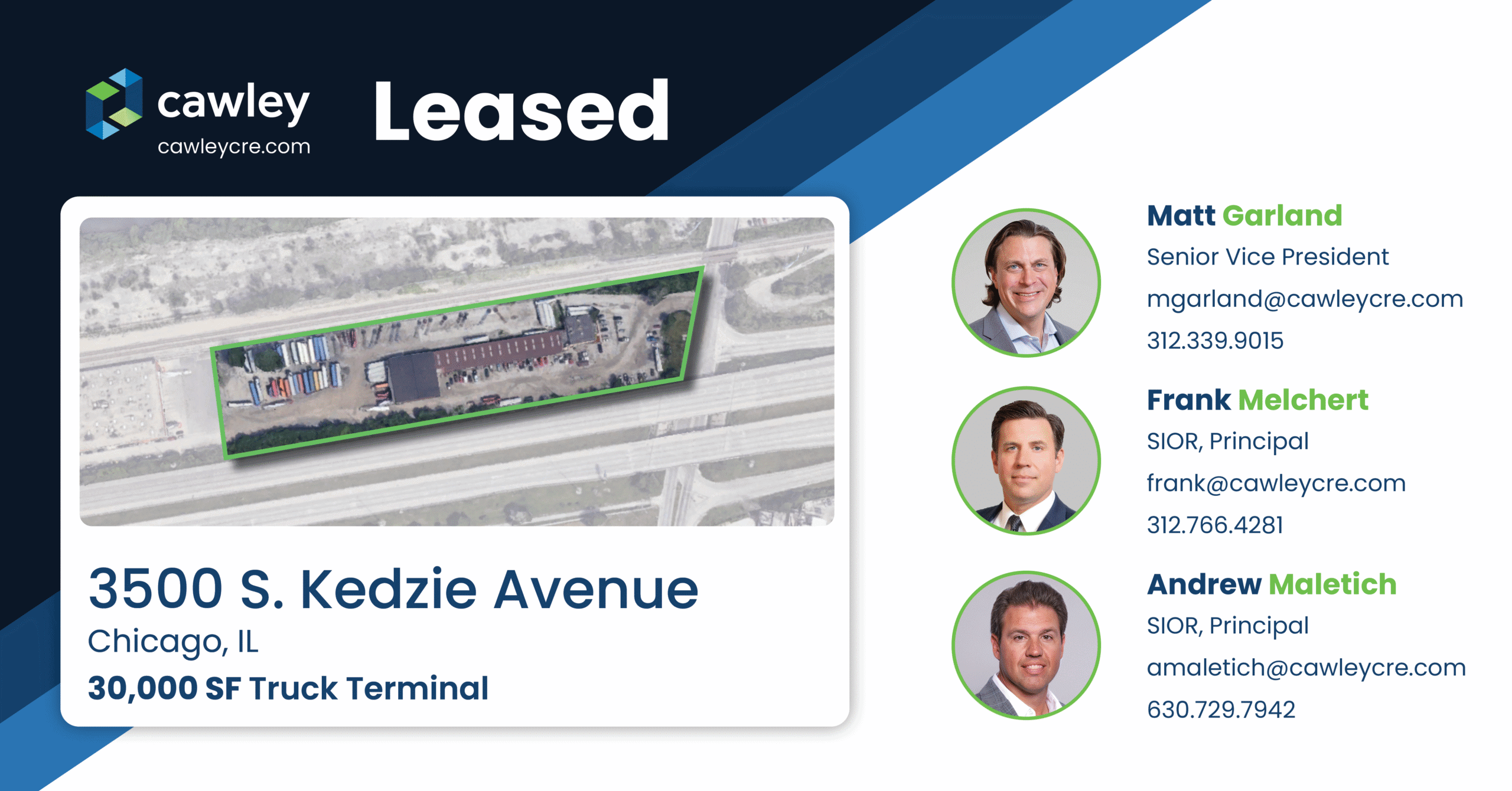 Cawley Commercial Real Estate (Cawley CRE) announces the successful facilitation of a new lease at 3500 S. Kedzie Avenue in Chicago, Illinois. The Cawley team, representing both the tenant and landlord, included Matt Garland, Frank Melchert, SIOR, and Andrew Maletich, SIOR.